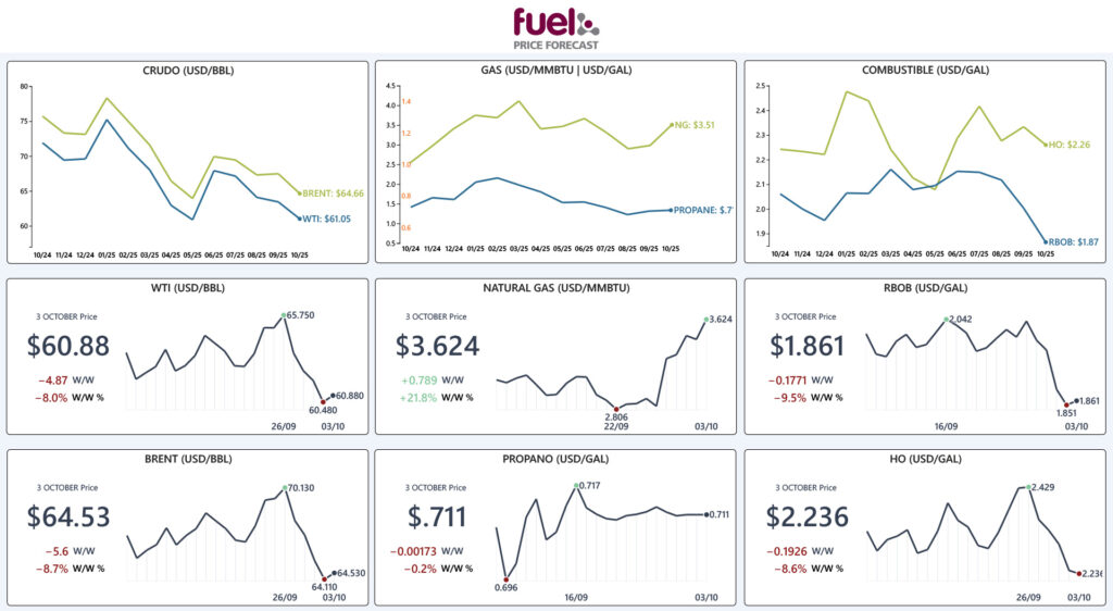 Los precios del petróleo crudo y sus derivados borraron las ganancias de la semana pasada y cerraron la jornada con una caída de más de $5.00 USD/BBL W/W, con los precios de la referencia WTI acercándose a la barrera de los $60.00 USD/BBL, su nivel más bajo en 5 meses y los precios de los futuros más cercanos de gasolina RBOB en su nivel más bajo en 4 años y medio. La bajada más importante se dio al inicio de la semana después de que se diera a conocer que la OPEC+ desea continuar con su plan de aumentar las cuotas de producción en 137,000.00 bpd. Esto sin contar con el aumento de la oferta de crudo proveniente de la región curda de Irak, lo que podría sumar otros 500,000.00 bpd al mercado mundial. Los precios limitaron sus pérdidas debido a un nuevo máximo histórico del S&P 500, un dólar más débil y al riesgo geopolítico que sigue rodeando a Rusia.