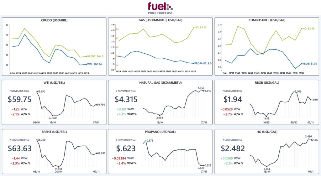 Los precios del crudo y sus derivados cerraron la semana con su segunda caída consecutiva, nuevamente pese a diversas señales alcistas en el mercado, con los precios de la referencia WTI cerrando por debajo de la barrera de los $60.00 USD/BBL después de registrar una caída de $1.23 USD/BBL W/W. El informe semanal de la EIA mostró un inesperado aumento de los inventarios de crudo en +5.2 millones de barriles, frente a las expectativas de una ligera disminución. Asimismo, los inventarios de destilados cayeron menos de lo previsto (-643,000 barriles frente a -2.5 millones esperados), lo que añadió presión al mercado. A su vez, Arabia Saudita redujo el precio de su crudo Arab Light para Asia a su nivel más bajo en once meses, una medida que refuerza las preocupaciones sobre la debilidad de la demanda en la región.