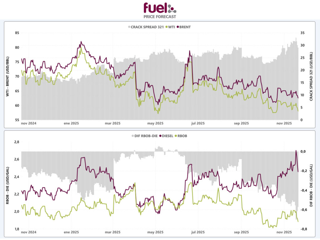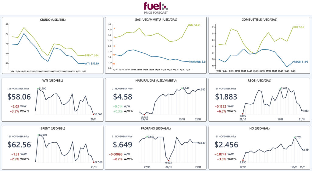 Los precios del petróleo crudo y sus derivados borraron las ganancias de la semana pasada y cerraron a la baja al cierre de la jornada del día de hoy después de registrar una caída de $1.83+2.03 USD/BBL y los precios de la referencia de crudo operando por debajo de la barrera de los $60.00 USD/BBL. El mercado se vio bajo presión a media semana después de que se revelara que Estados Unidos se encontraba nuevamente negociando un Plan de Paz para poner fin al conflicto entre Rusia. Sin embargo, la caída se vio limitada después de que el presidente de Ucrania, Volodímir Zelenski, así como la de otros miembros de estado de la Unión Europea, rechazaran puntos clave del borrador. Este rechazo volvió a introducir dudas sobre un posible levantamiento inmediato de sanciones, devolviendo parte del soporte geopolítico habitual en el mercado petrolero.